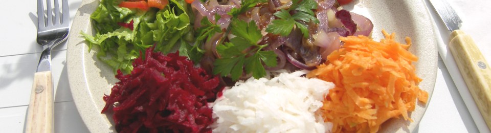 Preocupo-me em ingerir proteínas, hidratos de carbono e vitaminas nas proporções adequadas. Gosto muito de saladas e tento sempre que sejam o mais saudáveis possível. Adoro ver todas estas cores no prato. Cores são vitaminas. Para esta refeição ligeira, escolhi alface, cenoura, nabo e beterraba ralados, pedacinhos de pimento vermelho, tomate, aipo e salsa. Para complementar juntei um hambúrguer de cenoura e algas, cozinhado com cebola e alhos. Temperei com rosmaninho cultivado por mim.