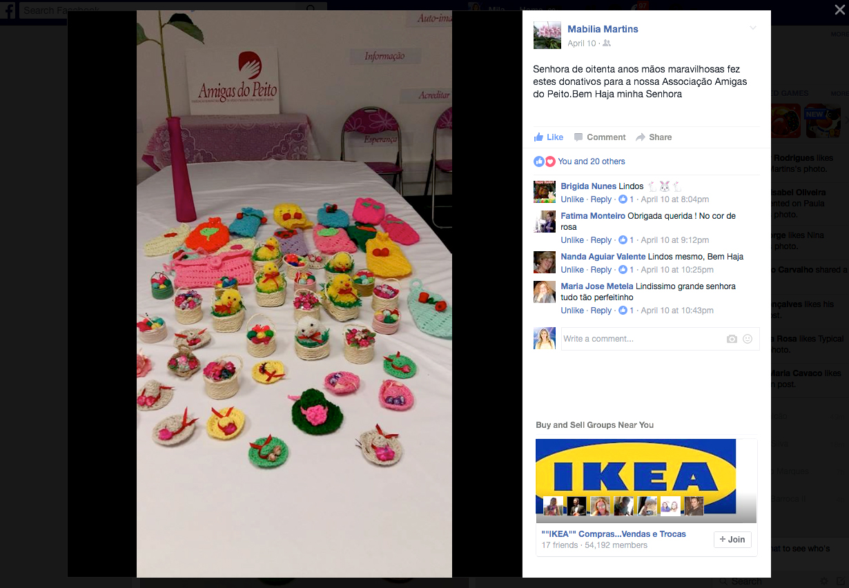 A minha querida mãe tem 84 anos, cumpridos no dia 6 deste mês. Sempre teve uma grande criatividade e um enorme talento para fazer artesanato. Aqui ficam algumas das peças que fez, com todo o seu amor, para oferecer à Associação “Amigas do Peito” (apoio a mulheres com cancro de mama), para a venda de Páscoa. Obrigada querida mãe por estes miminhos 🙂
