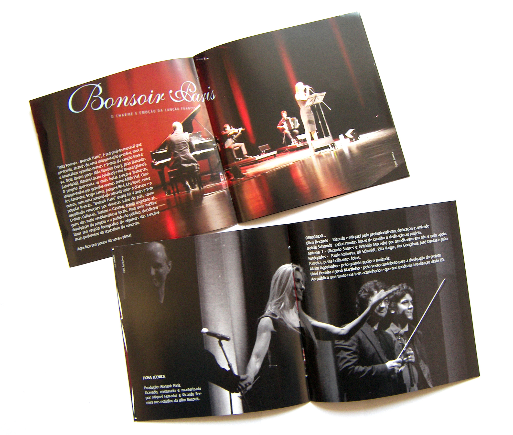 Lançamos hoje oficialmente o CD do projeto Mila Ferreira “Bonsoir Paris” – O charme e a Emoção da Canção Francesa. Depois de muita dedicação da nossa parte (João Barradas, Marcos Lázaro, Rui Moura e eu) e da Blim Records, aqui está o CD que inclui algumas das canções mais emblemáticas da música francesa e que fazem parte do reportório do nosso concerto. Com este CD pretendemos evocar estes grandes temas e homenagear estes grandes cantores e compositores, prestando o nosso tributo, à nossa maneira, com toda alma, respeito e emoção. Espero que gostem do nosso trabalho e que aqueles que tanto queriam um CD, após o concerto, o possam finalmente adquirir. Bonsoir Paris, agora em CD!